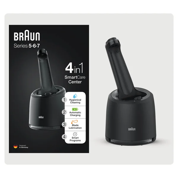 Expertly cleanse your grooming device with the Braun 4-in-1 SmartCare Center. The ingenious product is compatible with Series 5, Series 6, Series 7 razors, allowing it to be highly versatile and practical. Debris and grime can very easily build up on your shaver, with skin particles and hair potentially lowering the effectiveness of the device. Equipped with a sophisticated alcohol-based cleaning solution, the razor cleaner offers a deep and intensive purification, stripping the blades of anything that could minimise your shaving experience.