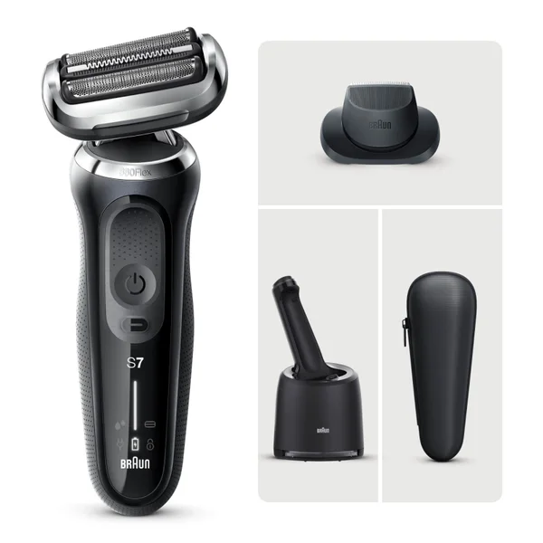 Included: Series 7 electric shaver for men – black, 4in1 smartcare centre, precision trimmer attachment, protective cap, smart plug for automatic 100-240 voltage adjustment, cleaning brush, pouch.
