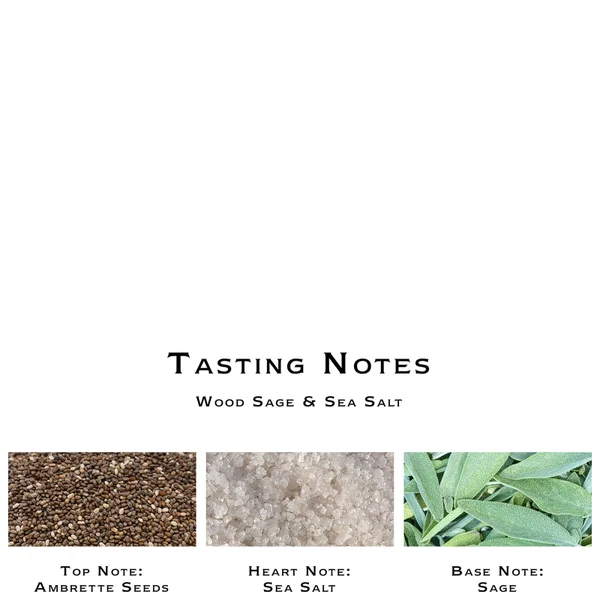 Top Note: Ambrette Seeds. Heart Note: Sea Salt. Base Note: Sage.