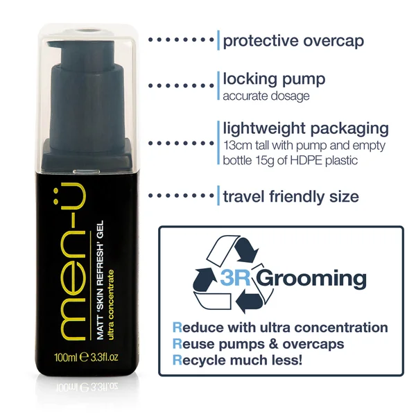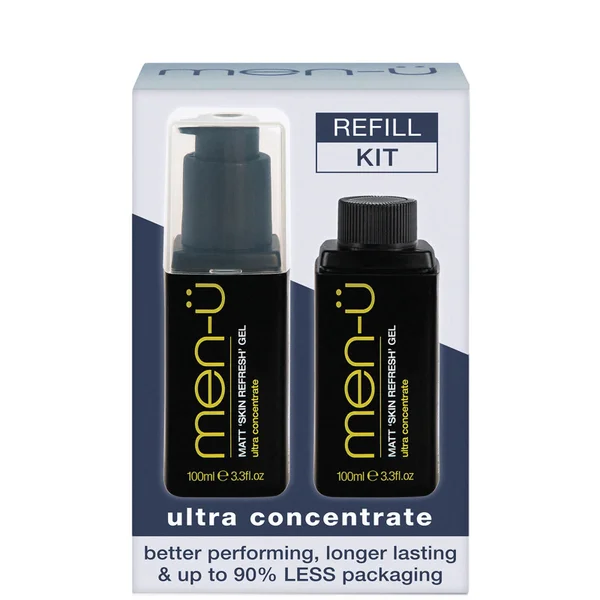 Refresh your complexion with the men-ü Matt Skin Refresh Gel. This handy refill kit contains 1 pump with 2 x 100ml of ultra-concentrated formula, designed to last for up to 120 washes.